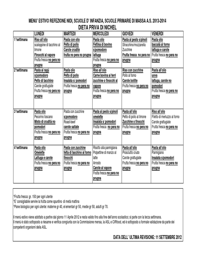 Nuovo Dieta Priva Di Nichel: Menu’ Estivo Refezione Nidi, Scuole D’ Infanzia Ultimo